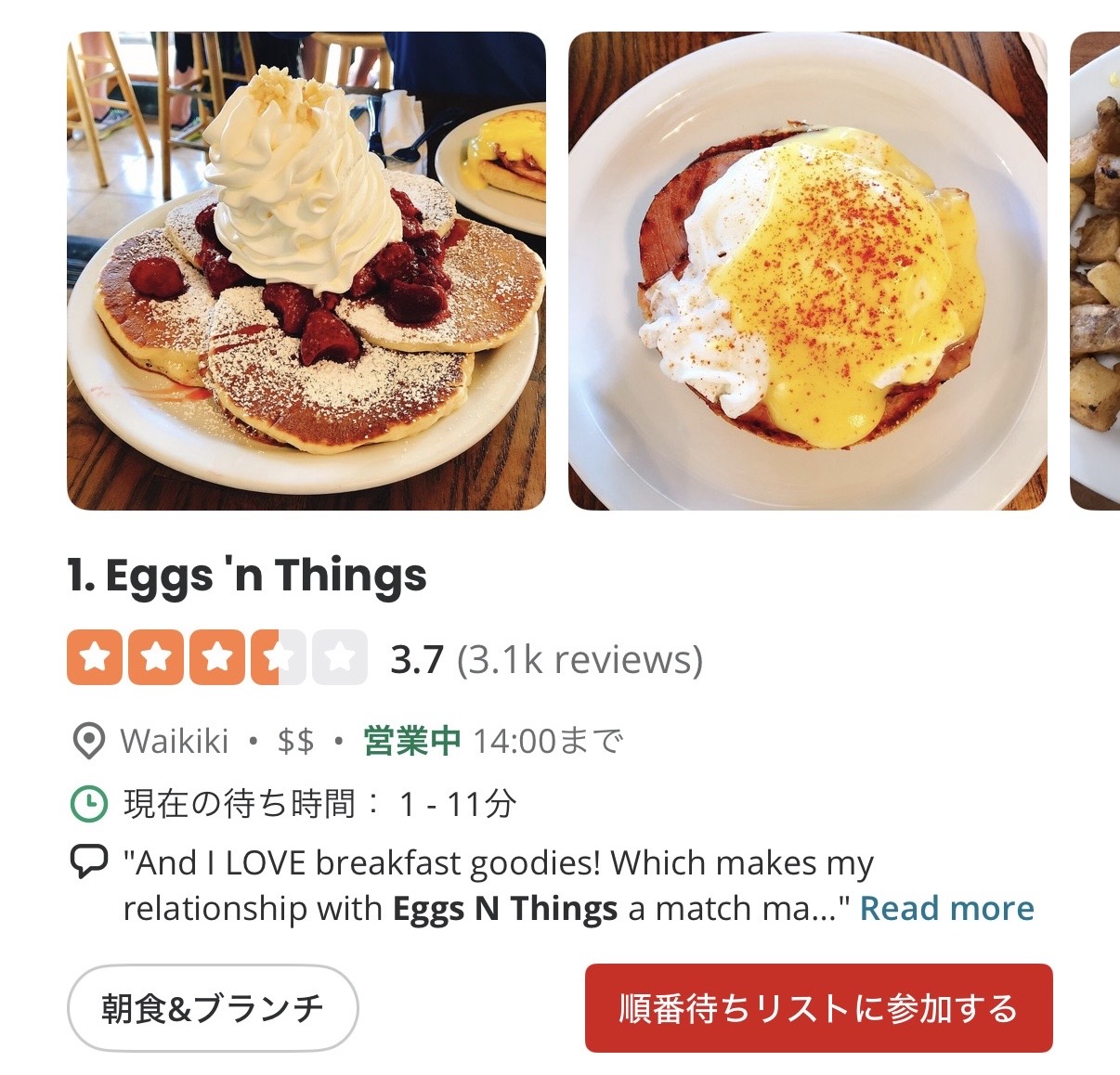 エッグスンシングスでは混雑時の待ち時間解消のため、Yelpアプリからの予約受付をしているのをご存知ですか?現在予約受付をしているのはオアフ島内4店舗で、平日のピーク時間(7:00〜8:00、12:00〜14:00)までとなっております。なお、ピーク時間外、週末、休日に関しては予約受付はしておりませんので、ご注意ください。