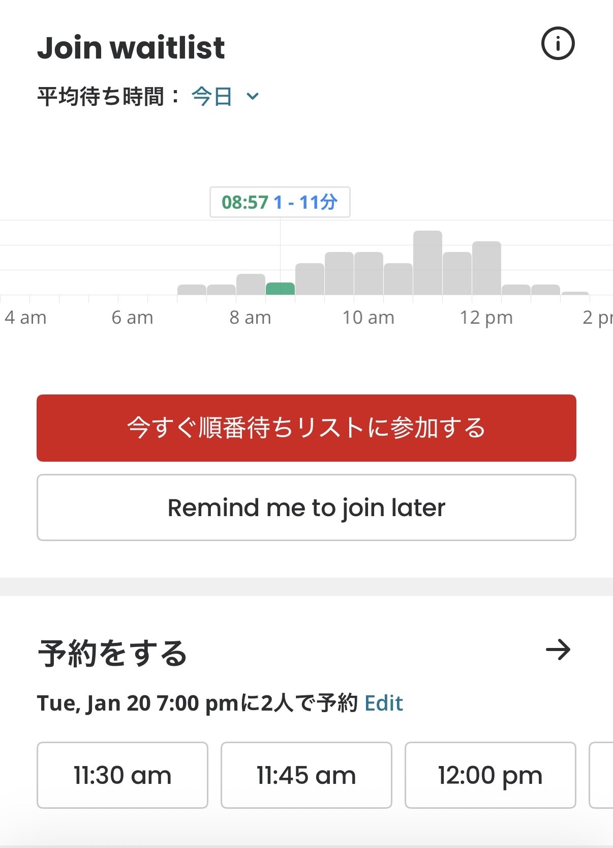 ・各店舗の情報の場所に、「現在の待ち時間」が表示されていますが、混雑している場合は、その下部にある「順番待ちリスト」をクリック!